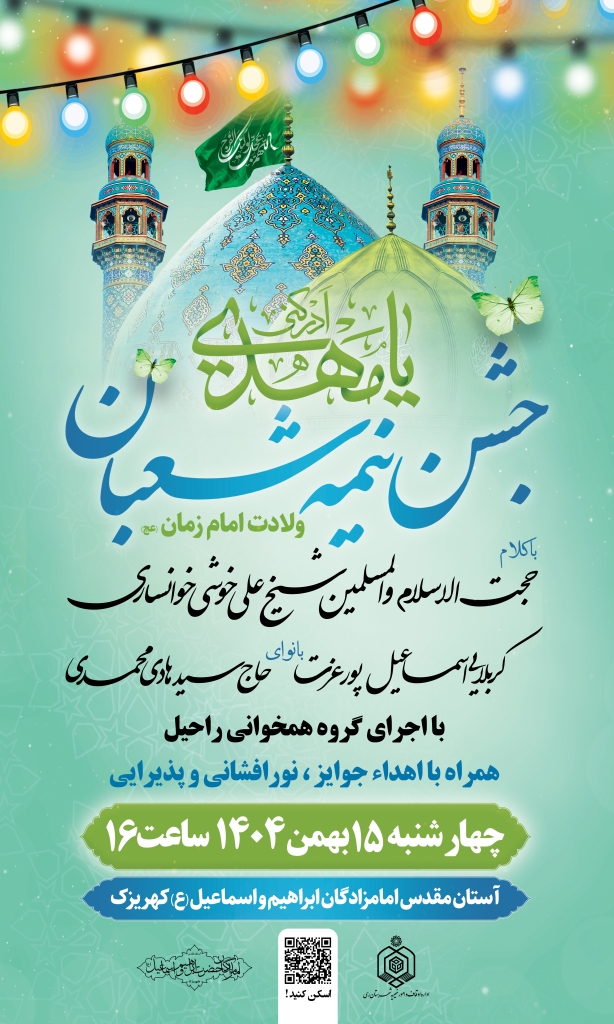 در شامگاه چهارشنبه ۱۵ بهمنماه، همزمان با فرارسیدن نیمه شعبان و سالروز ولادت باسعادت حضرت ولیعصر امام زمان (عج)، آستان مقدس امامزادگان ابراهیم و اسماعیل (ع) کهریزک غرق در نور، شور و معنویت شد و میزبان خیل عظیمی از عاشقان و منتظران آن حضرت بود .