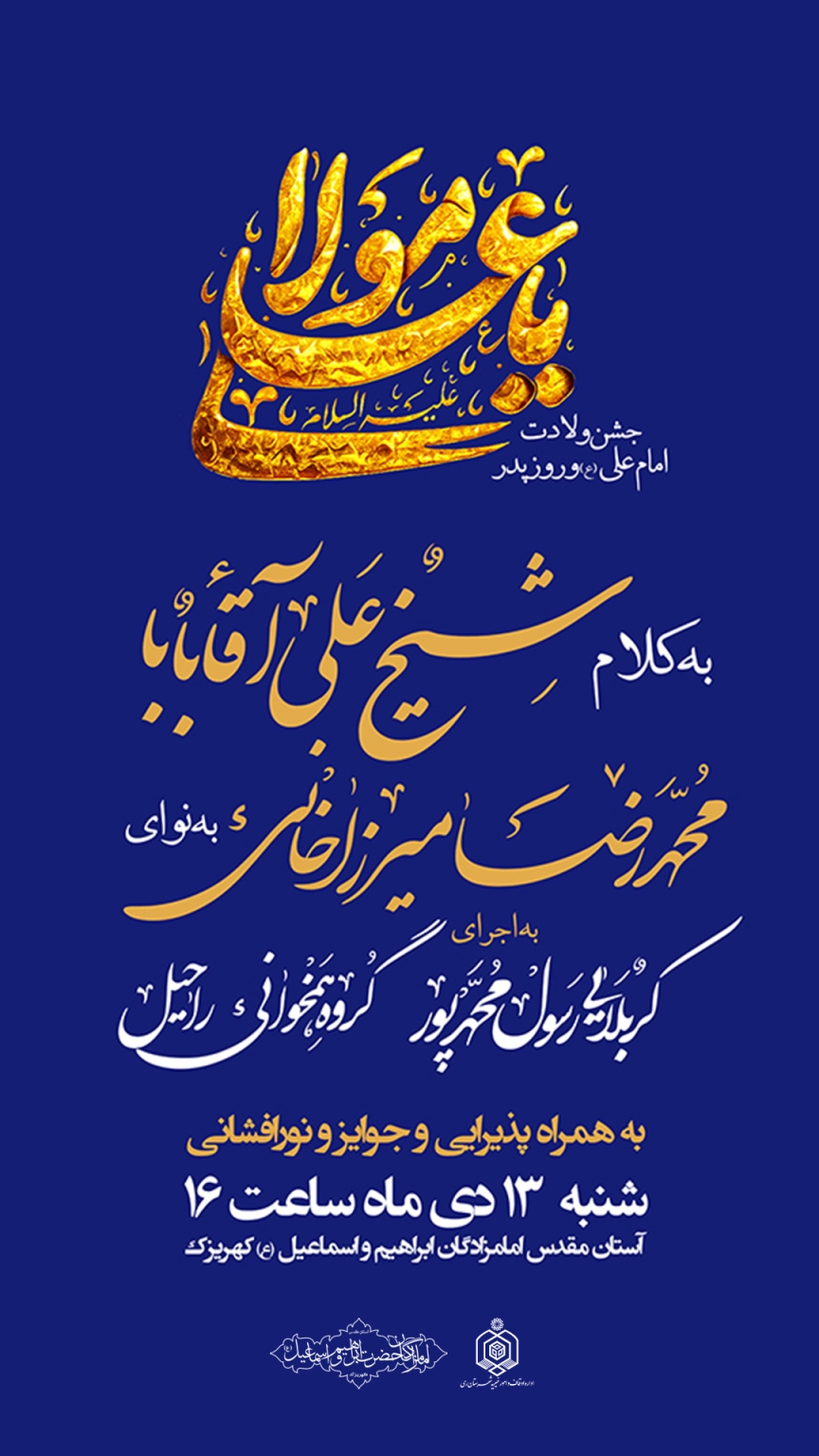 مراسم باشکوه جشن ولادت باسعادت امیرالمؤمنین حضرت علی علیه‌السلام و گرامیداشت روز پدر، عصر روز شنبه ۱۳ دی‌ماه ۱۴۰۴ از ساعت ۱۶ با حضور پرشور زائران، مجاوران و همراهان گرامی، در محوطه صحن اصلی آستان مقدس امامزادگان حضرت ابراهیم و اسماعیل علیهماالسلام برگزار خواهد شد.